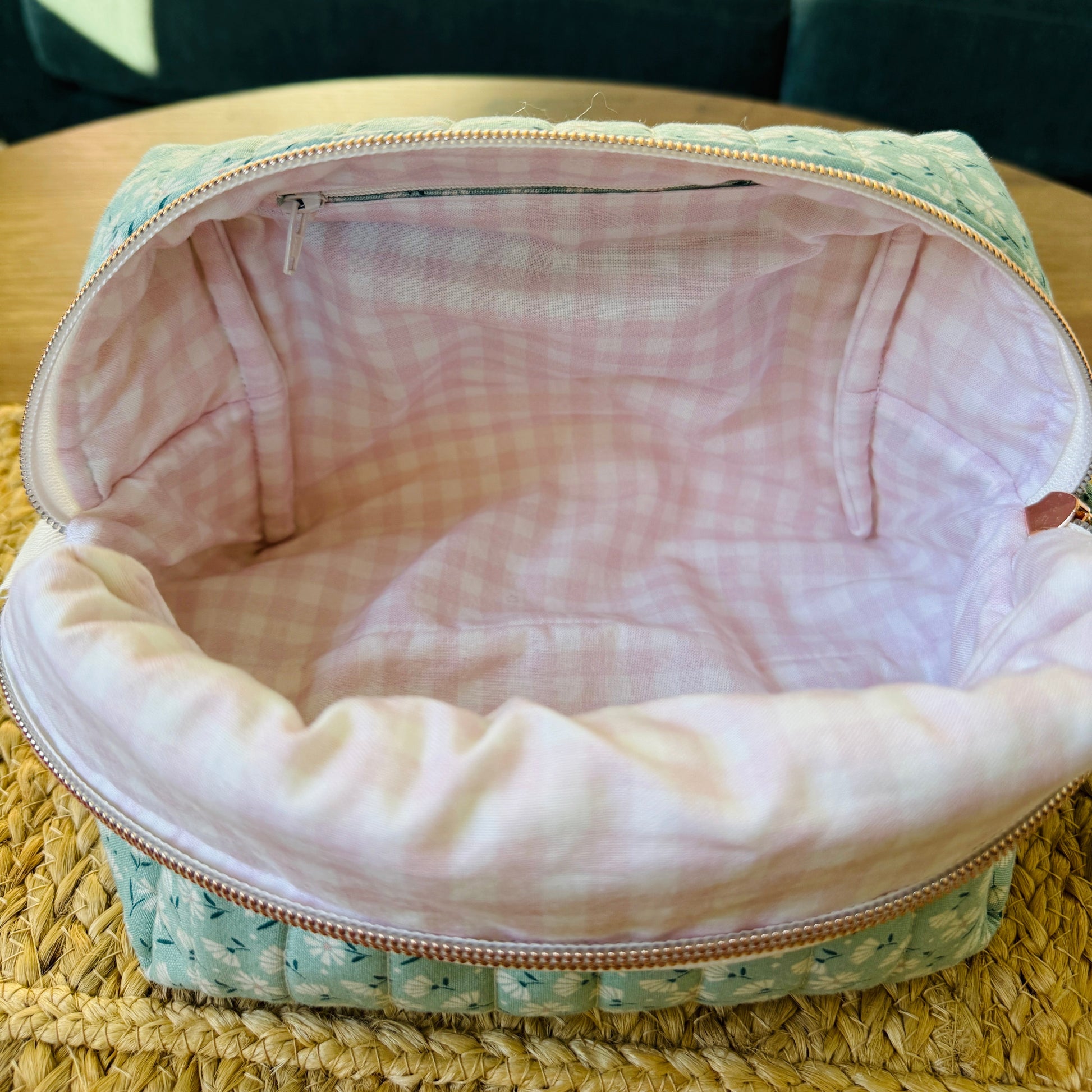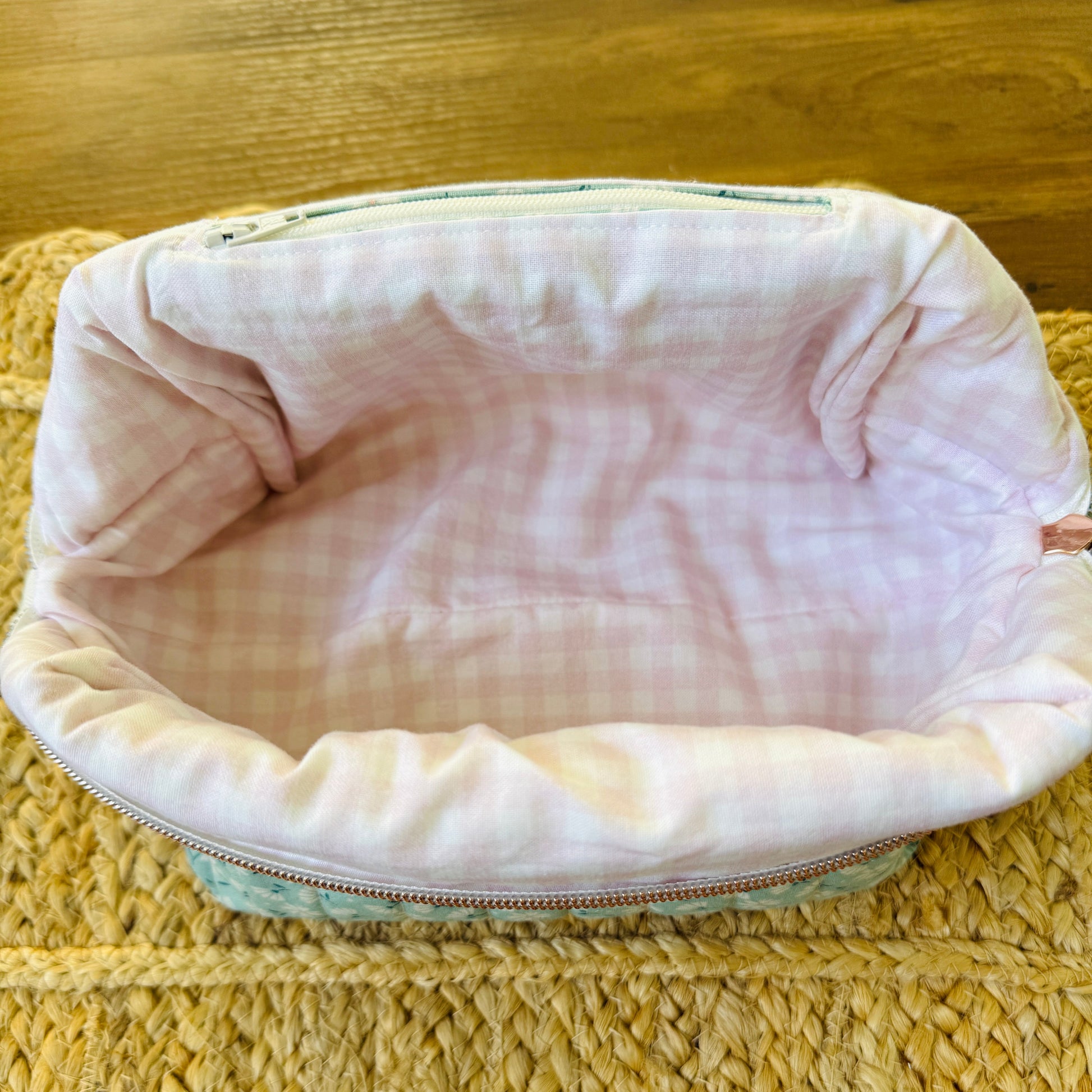 Handmade from 100% cotton fabric with a soft quilted texture, each bag is one of a kind. Featuring a white floral pattern on a dusty teal background with light pink gingham lining. This boxy pouch is perfect for everyday use or travel.