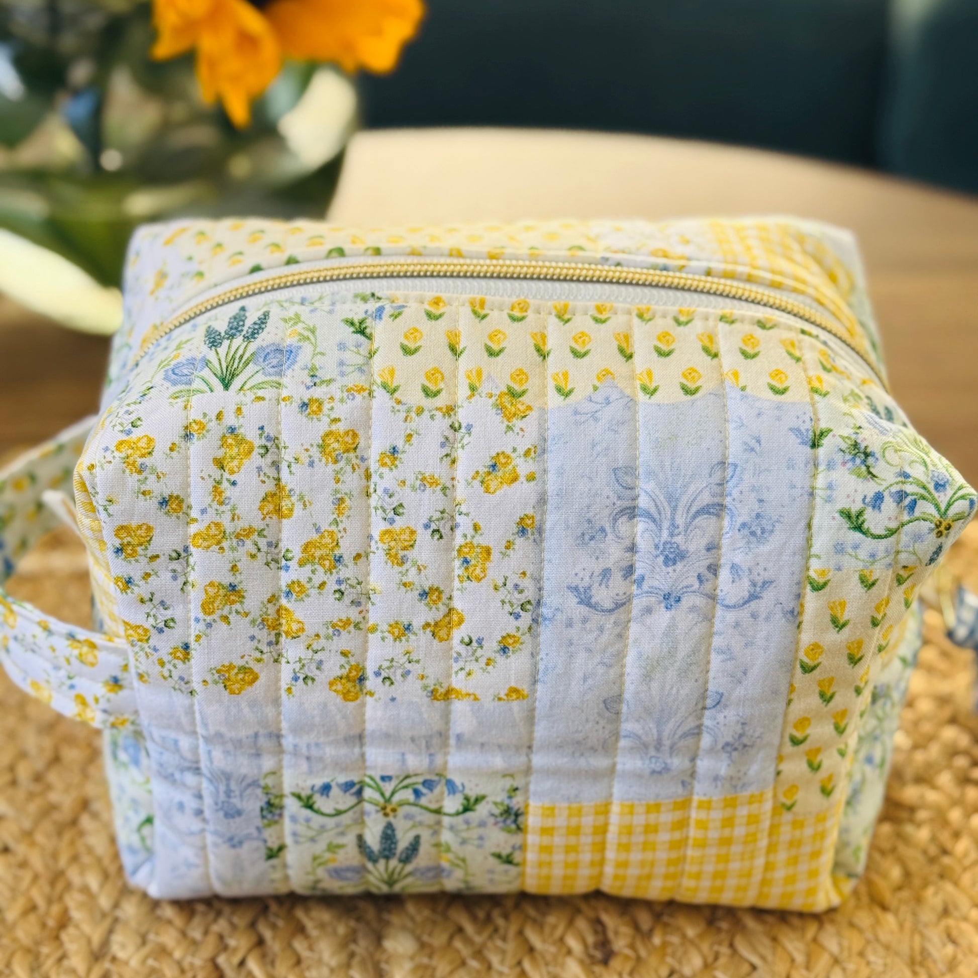 Handmade from 100% cotton fabric with a soft quilted texture, each bag is one of a kind. Featuring a blue and yellow cottagecore patchwork pattern with blue gingham print lining. This boxy pouch is perfect for everyday use or travel.
